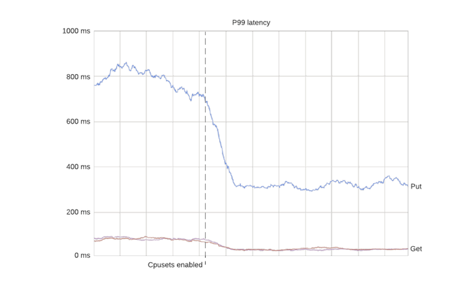 在这一点上值得注意的是,使用 cpusets 也有负面影响。特别是,P50 延迟通常会增加一点,因为它不再可能突入未分配的核心。结果 P50 和 P99 的延迟变得更接近,这通常是可取的。这点将在本文末尾进行更多讨论。