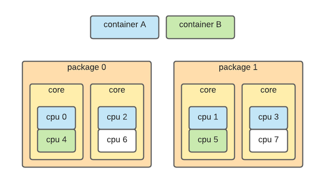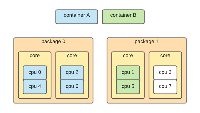 为了使用 cpusets,容器必须绑定到核心。正确分配内核需要一些关于现代 CPU 架构如何工作的背景知识,因为错误的分配会导致性能显著下降。