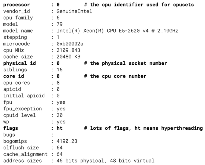 在这种情况下,一个容器被安排在物理套接字和不同的内核上,这会导致性能下降——我们已经看到由于错误的套接字分配,P99 延迟降低了多达 500%。为了处理这个问题,调度器必须从内核收集确切的硬件拓扑,并使用它来分配内核。原始信息在 /proc/cpuinfo 中找到: