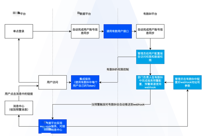 同时,有数BI还具备多渠道的数据预警与推送能力(如邮件、短信、企微、钉钉、webhook)等也是Tableau所不具备的,下图为基于第三方OA平台的数据推送方案流程图: