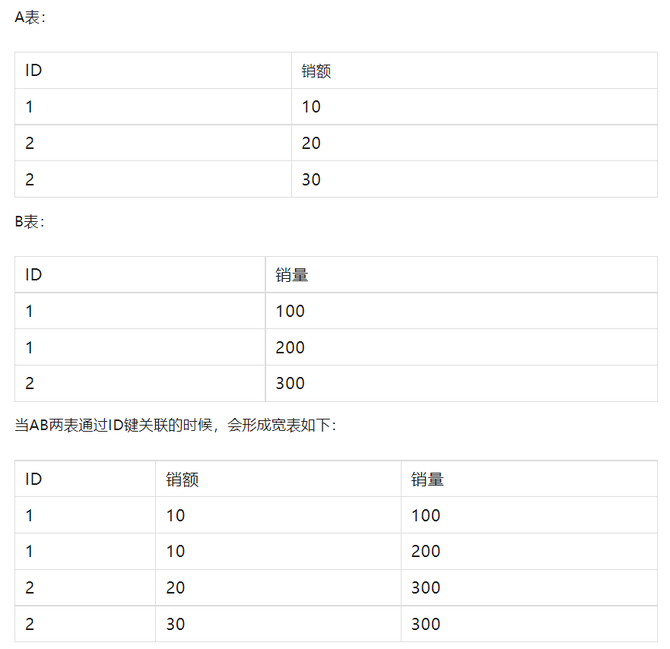 实际上 ID=1的销额应该为10,销量为100+200=300,而ID=2的销额为20+30=50,销量为300,但如果根据宽表直接计算则会得到 ID=1 ,销额为20,销量为300;ID=2,销额为50,销量为600 。