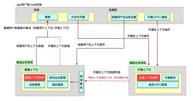 C端有两路数据流,一路是看端领域闭环的数据流,第二路数据流是B端的数据流(开关播上下文、房间状态变化上下文)