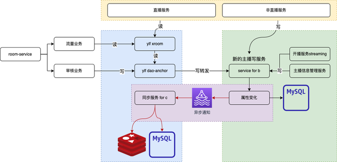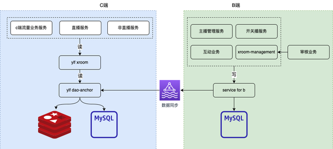 房间核心系统耦合了消费端和生产端的逻辑,基于CQRS理论需要将服务和数据库完全解耦,承担高流量的xroom/dananchor服务划分为C端业务域服务,新的B端服务闭环接受内容生产的读写请求和后台管控聚合请求(写多读少)。