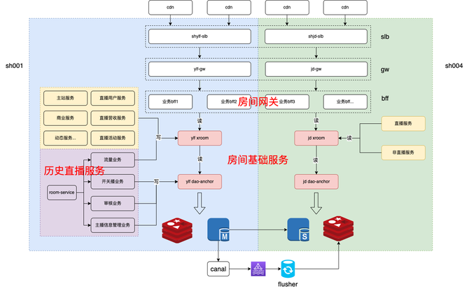 可以看到房间服务有众多的请求上游,必须在读写切分过程中,保障好数据的一致性(B端业务域内强一致性,C端业务域内最终一致性)和服务的可用性(底层服务抖动会有放大效应)。