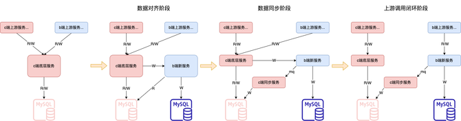 此阶段完成C&B分写逻辑,通过在DAO层控制BC表级和字段级的写入控制,将写操作分流到B和C的各自服务内,并且通过消息事件,来同步数据变更。此阶段完成了数据拆分和同步的目标。