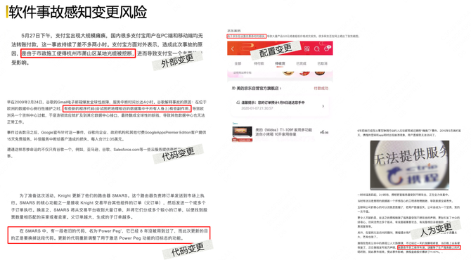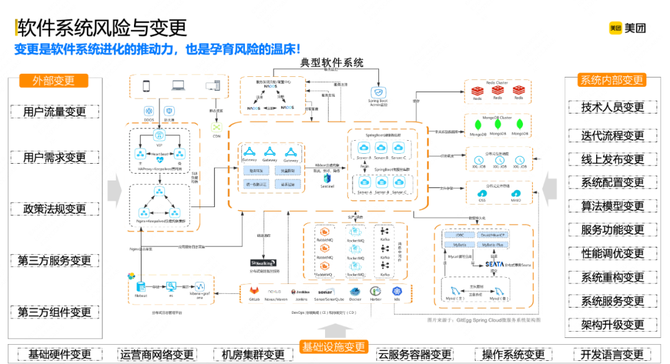 系统内部变更:比如技术人员迭代、新功能发布以及系统整体架构的升级等,这是驱动系统软件进化的核心变更因子,也是最频繁的变更风险发生地。