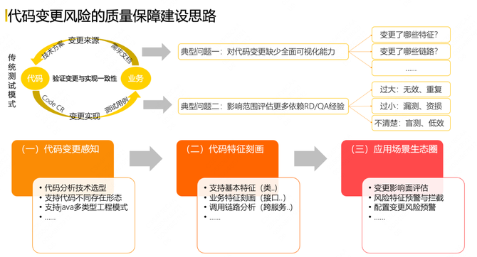 传统测试模式存在两个典型问题:第一,对于研发开发的代码,缺少全面可视化分析能力;第二,对于代码变更所产生的影响范围有多大,实际上更多地依赖研发人员和QA的经验。所以,在这样的传统测试模式的典型问题情况下,我们希望从3个维度做质量保障建设方案: