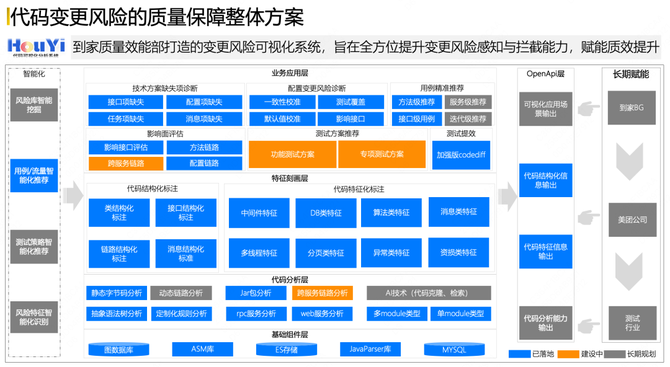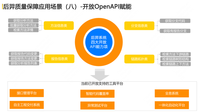 第八个应用场景的能力是开放Open API的赋能能力,我们希望将后羿系统分析识别的信息,通过开放API的方式透露出去,能够给到对应相关工具平台使用。目前在到家范围内已经将整个能力开放给了接口管理平台、智能代码覆盖率平台、全息系统、异常测试平台、自主工程交付系统以及一体化自动化平台这六个核心的效能工具建设平台。