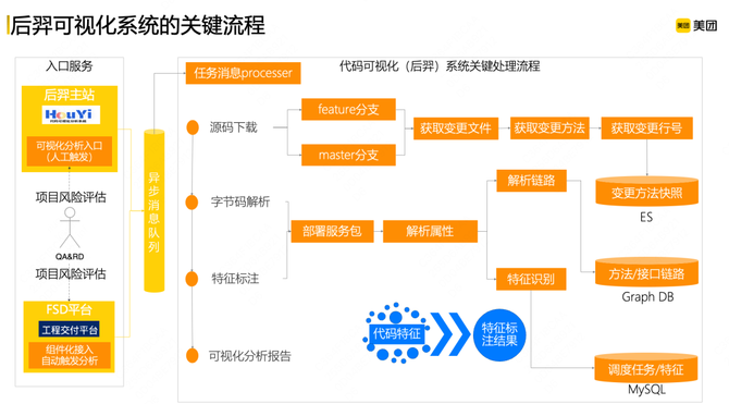 总的来说,对于后羿可视化系统的关键流程,在应用层的透出是通过两个入口进行感知:一是后羿主站;二是工程交付平台。我们通过异步消息感知分析任务和源码下载,获取对应的变更文件、变更方法和变更行号;同时再借助字节码解析能力,解析对应的调用链路变更情况,存储到图数据库里;再对变更代码做特征打标和识别;最后会产生一份可视化分析报告,直接给到对应的QA使用。