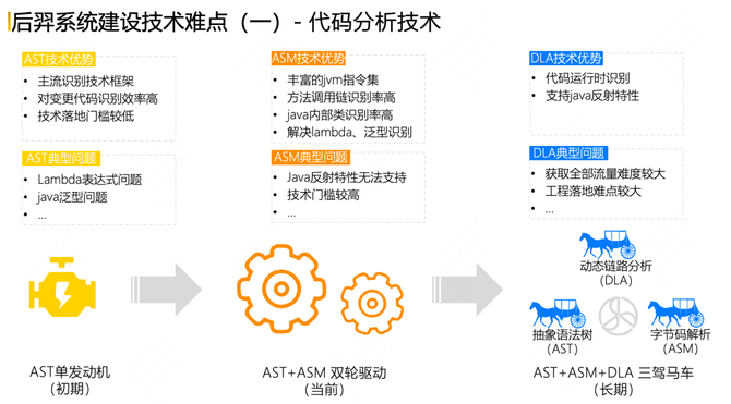 第一个挑战是代码分析技术。在系统建设初期,通过AST单分析能力做代码分析和识别,但存在Lambda表达式识别问题和Java泛型识别问题,在此基础上引入了ASM字节码分析技术解决了前面的问题,但ASM也会有自己的Java反射特性相关问题无法识别。所以我们希望未来引入动态化代码分析技术,来解决反射类问题。