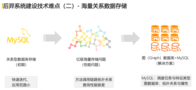 第二个技术难点是海量关系数据存储问题。在建设之初,通过关系型数据库做存储,但随着系统的广泛应用,存储了大量调用链路拓扑关系数据,但它的查询性能非常差。所以在此基础上,我们通过探索引入图数据库的存储方式,解决了在海量数据关系存储数据的查询性能。