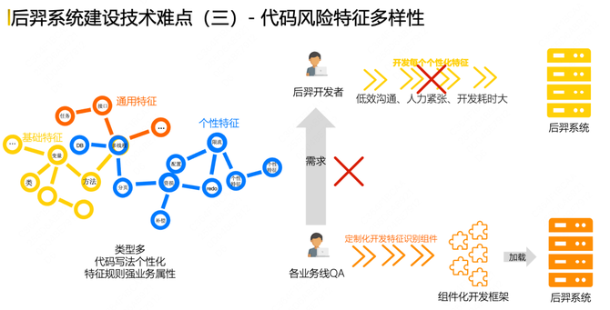 第三个技术难点是代码风险特征多样性,像个性化特征跟我们的业务有强相关性,比如资损特征、对应的分页特征和多线程特征。针对这种风险特征,我们之前的开发模式是系统开发者和业务QA深度沟通对应的识别策略,但这样的方式沟通效率和开发周期都比较长。