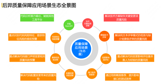 接下来,我们重点给大家介绍系统的实践应用落地情况。如下图所示,该图为后羿质量保障应用场景生态全景图。目前后羿系统整体建设了八个核心应用场景: