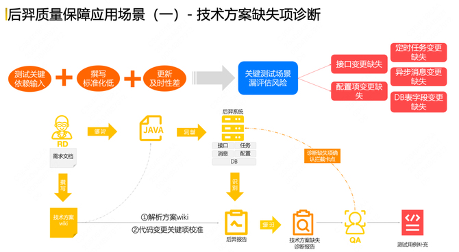 基于这样的情况,后羿系统通过对代码的识别,能够真正拿到在本次代码层面上,真正变更了哪些信息,再拉取对应的技术方案做解析,再做关键变更信息项的Diff,从而生成一份技术方案的缺失项诊断报告给到对应的QA,QA可以根据此报告做对应的诊断项卡点拦截,同时做测试用例的完善补充。
