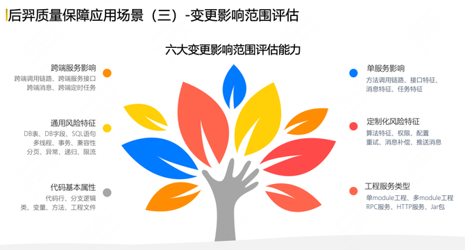 第三个应用场景是变更影响范围评估,目前后羿系统构建了六大变更影响范围评估能力: