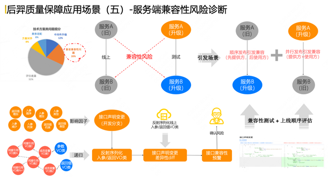 第五个应用场景是服务端兼容性的风险诊断。我们通过对线上问题做汇总分析发现,新老兼容性这类典型问题占比较高,我们尝试通过后羿系统解决,QA能够做简单的兼容性问题识别,比如一个接口的入参返回值有明显的字段新增或类型变化会明确判断出来。