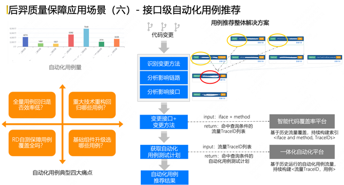 第六个是接口级自动化用例推荐,对于到家的复杂业务,我们沉淀的很多自动化用例怎么用,是全量回归还是选择性筛选,也是比较大的痛点问题。因此后羿系统基于所具备的识别变更方法、分析影响链路以及对应的接口能力,打通和到家智能代码覆盖率平台所具备的历史流量覆盖情况,能够快速拿到变更接口和方法,再借助一体化平台,拿到对应的自动化用例,做精准的自动化用例推荐,从而构建了用例推荐整体解决方案。