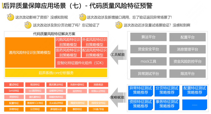 第七个典型的应用场景是代码质量风险特征预警,我们在质量建设过程中,往往会遇到一类比较特殊的场景需要验证,比如资损类场景,除了验证功能外,还需要对资损做个性化风险功能场景验证、异常场景验证、特殊分页逻辑、重试场景验证,但这些场景在整个代码过程中,我们往往很难发现这些特征风险,从而忘记验证特殊场景情况。