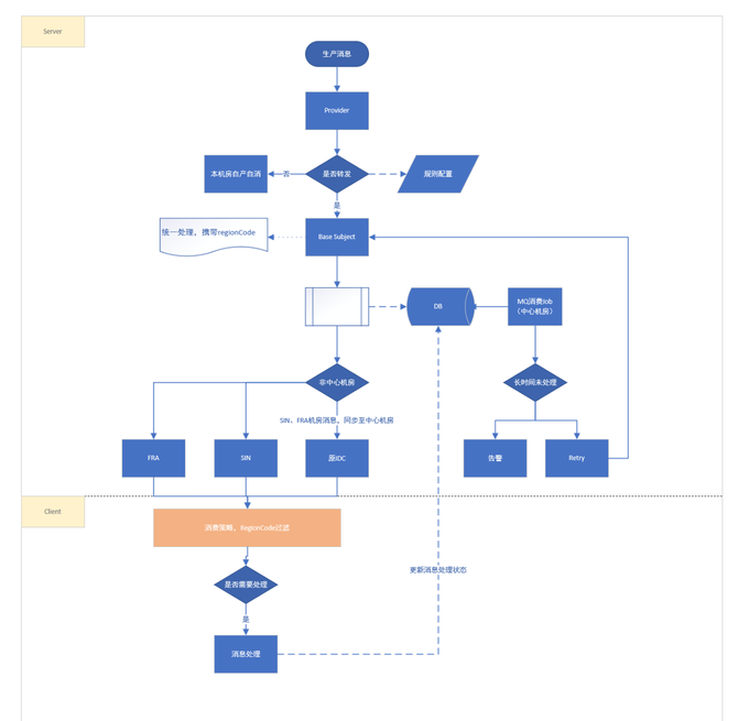 跨Region场景:需要跨Region的MQ通过BaseSubject同步到中心机房Region,来保证正常业务流程