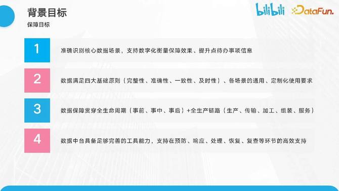 第二个保障目标是确保数据满足四个基本原则:完整性、准确性、一致性和时效性。同时,还需要满足各个用户实际场景的定制化需求。