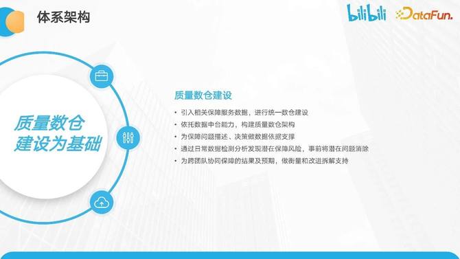 基于上述目标,我们以质量数仓建设为基础,构建三大核心能力:完备的质量保障体系、数字化驱动持续优化,以及高效的故障处理能力。