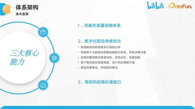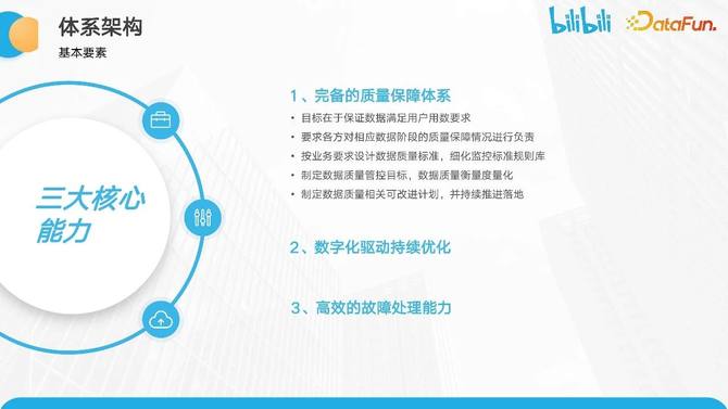 第一个核心能力是完备的质量保障体系。目标是确保数据满足用户要求。各方需要对数据质量负责,并按照标准监控数据质量。我们会沉淀规则库,为实现保障目标提供服务,并推进可持续改进计划。