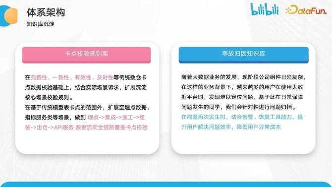 在这个体系中,我们将通过数据资产的定级来触发加工链路的卡点校验,并进一步监控数据风险点。这包括常见的数据保障实体、基线任务和模型,并通过这些来衡量数据质量的效果。其次是构建质量分衡量机制,并支持从多维度的视角进行衡量。最后是制定保障规则,并识别各个数据资产的待优化项。在这个过程中,有两个重要的方面需要提及,第一个方面是卡点校验规则库,这个规则库主要涵盖完整性、一致性、有效性和及时性等与数仓传统卡点校验相关的内容,我们在此基础上将进一步扩展到埋点、集成、加工、组装、出仓和 API 服务等相关环节;第二个方面是建立事故归因知识库,这个知识库主要用于归因相关的问题,并结合告警和恢复工具的能力,提高用户解决问题的效率,降低异常成本。