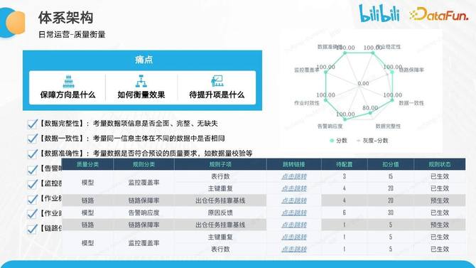 另一方面的痛点是无法衡量保障效果。我们上学时都对分数有着深刻的体验,分数可以衡量学习的好坏。同样的逻辑也适用于数据质量保障,但我们无法衡量我们的保障工作对整体目标的贡献。其次是当前保障推进到什么阶段,缺乏相应的指标来指导和持续优化,需要持续衡量的方法论。