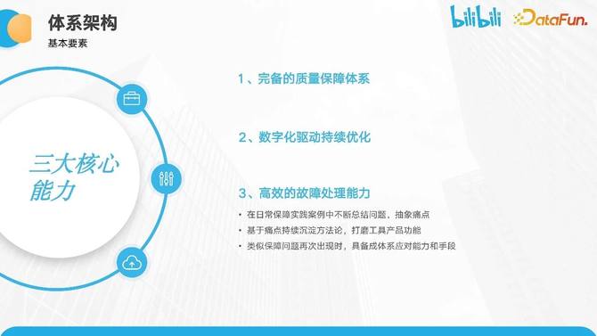 第三大核心能力是高效的故障处理能力。根据过去的保障实践经验,质量问题是难以避免的。在面对质量保障问题时,我们需要快速响应,将问题最小化,甚至在短时间内实现快速恢复,以确保用户无感知。这是一个重要的方向。