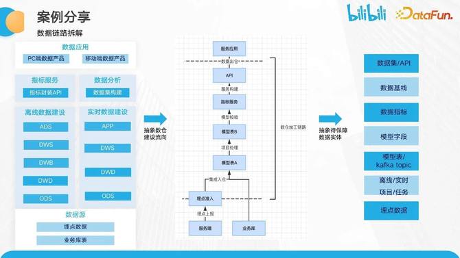 1、在数据链路拆解环节,我们将中台链路简图进一步抽象成数仓的建设流程。包括从埋点数据转入数仓加工,数仓模型校验和数据服务构建,API 构建,最终将数据出仓给服务应用。在这个过程中,我们还可以抽象出保障的数据实体。当前的中台保障实体包括埋点、离线和实时项目任务,模型表、Kafka 主题,模型字段数据指标,数据基线以及数据基线 API 等相关实体。