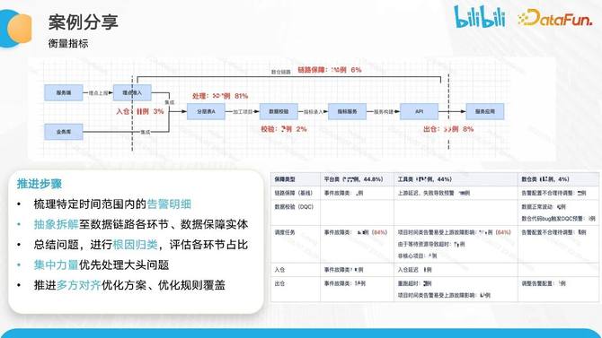 在分层方面,我们进行了明细层、进度汇总层和高度汇总层的区分。在这些分层中,我们将保障效果的数据进行抽象,包括异常清单和告警情况,并进行相应的数据建设,最终呈现在看板上。这为数仓团队和横向团队提供了数据能力,包括质量分运营看板、实时保障看板和告警归因看板等一系列数据服务能力。