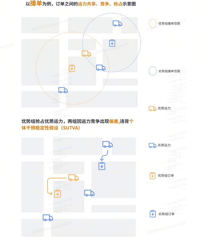 在货运行业的交易场景中,一大挑战来自传统个体分流方法(例如,基于订单ID或用户ID)的不适用性。这主要是因为在同一时间空间里,实验组和对照组的策略并行存在,造成了各组之间运力的互相竞争。