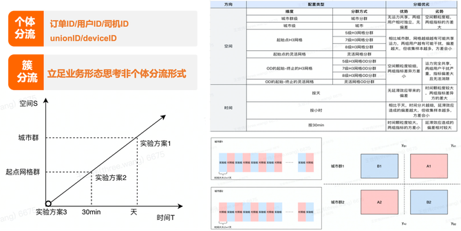 在选择簇的时候,我们会根据实验内容和目标进行全面评估。通常所选择的簇涉及多个维度,包括时间和空间,有时甚至会是时间和空间的复合组合。一个具体的例子是我们提出的先进实验方案:“城市群按天轮播”。这个方案结合了时间和空间的因素,以确保实验偏差降到最低,同时也降低了实验效果的方差,使得实验结果更为准确和灵敏。