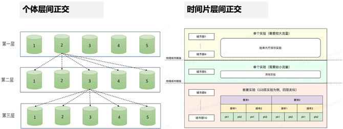在实验分流中,另一个关键策略是层间正交。为了确保不同实验之间的独立性,我们引入了个体层间正交和时间片层间正交这两种方法。具体操作上,我们在个体或时间片这两个层面设置多个层级,并通过级联的方式,将不同实验的流量均匀地组合在一起。
