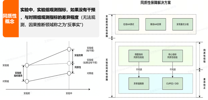 为了应对这一挑战,我们采用了多种方法来最大程度地确保群体的同质性。在实验前,我们通常进行AA测试和寻找最优分组方案来验证和保障群体的同质性。如果在实验后发现存在同质性的偏差,我们也有相应的修正措施。例如,我们会使用CUPED(Controlled Experiments Using Pre-Experiment Data)或DID(Difference-in-Differences)等统计方法,结合实验外的协变量信息,来校正这些偏差。
