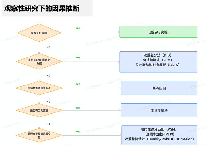 在不能进行AB实验的情况下,观察性研究通常成为评估干预效果的重要手段。这种研究方式不依赖于实验和对照组的随机分配,而是利用现有的数据来进行因果关系的推断。虽然它可能没有随机控制实验那样精确,但在某些限制性条件下(如政策法规、成本、时间等因素限制)它依然能提供有用的洞见。