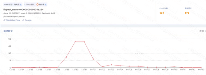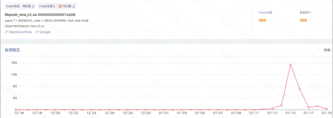 第一次排查发现是在依赖的底层平台 so 库中崩溃,经过沟通了解到其之前也存在过崩溃问题,所以升级相关底层 so 版本。重新发版后短期没有出现 Crash 大面积上报情况,只有零星上报,但不久后又发生了第二次大面积 Crash 上报。具体信息如下图所示: