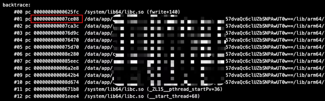第二次爆发后,通过分析 Crash 统计平台上的173次 Crash 日志信息发现,Crash 代码地址都是“000000000007ce08”,如下图,由于静态库中的代码地址都是固定的,所以对底层 so 库进行了代码定位。