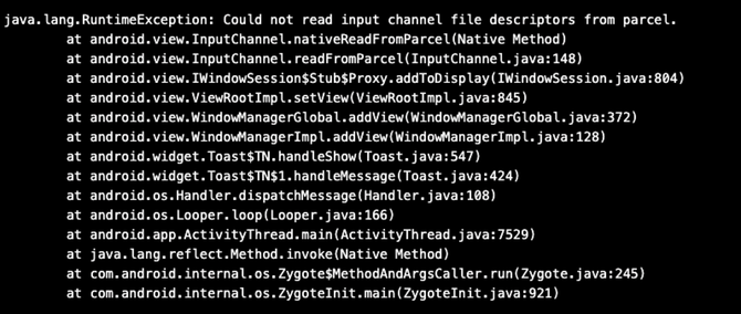 java.lang.RuntimeException: Could not read input channel file descriptors from parcel.