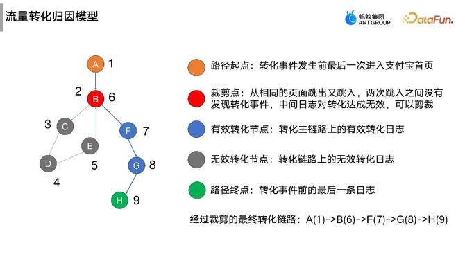 这是实时流量转化归因的整体技术架构,其中数据部分比较核心的是基于业务中间层的转化事件定义(如交易支付、权益核销等)和转化数据模型的 Schema 归一化。通过对不同转化事件类型的 Schema 归一化可以屏蔽不同业务的差异,便于下游消费使用。在此基础上,通过逻辑视图可以实现对不同业务场景分类消费的支持,大大提升了数据消费的效率。最后是基于流图的转化归因计算,输入是流量和转化事件,输出是转化的归因结果。