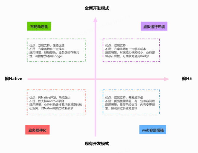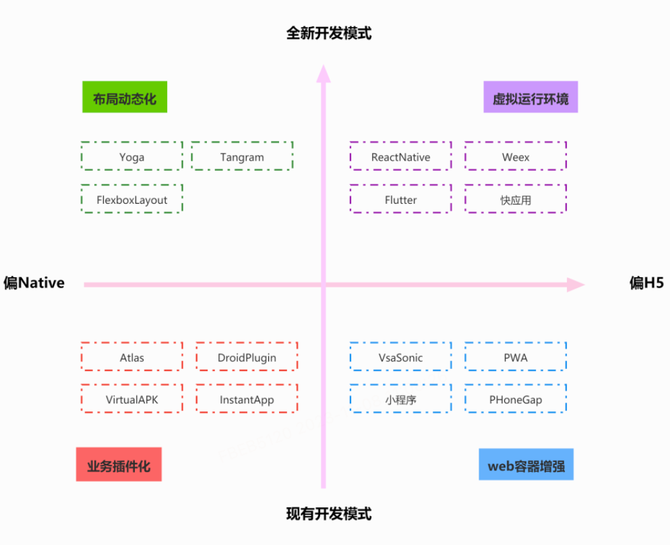 目前行业内比较常用具备热更新能力的方案大致可以分为四类:动态化布局、虚拟运行环境、业务插件化和Web容器增强。