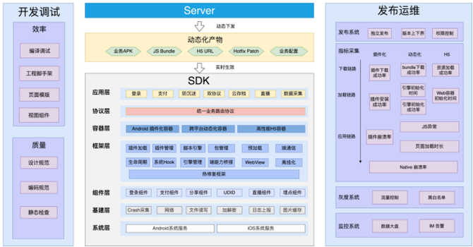 通过对SDK的分层化设计改造,以多容器化模式承载不同的业务场景;建立统一的业务路由协议,对业务模块进行路优化改造,实现多容器之间的调度与交互;通用组件和基架做下沉处理,实现多容器多业务服务用;最后建立完善的发布运维系统,保障动态化产物从构建→ 配置→ 白名单内测→ 灰度→发布等全流程的跟踪监控,结合完整的流程规范与能效工具,保障整个系统的高效性与稳定性。