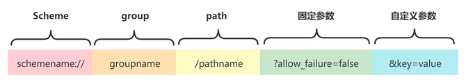 路由协议整体采用Scheme URL的格式,主要分为Scheme、group、path、固定参数和自定义参数几个部分,其中: