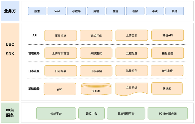 UBC(User Behavior Collection) SDK,即用户行为收集SDK,负责端打点日志的采集、封装、上报等功能,记录用户行为数据并上传至日志中台服务端,是日志中台数据传输链路的源头。