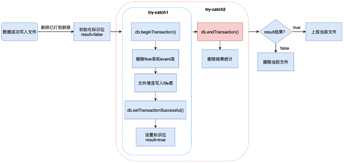 正常情况下,若写文件后删除数据库中已打包日志执行失败,SDK会终止上报流程并删除已生成的文件,中断发送流程避免重复打包。