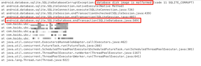 捞取重复用户的异常监控数据,发现存在大量SQL异常。堆栈如下,db.endTransaction时出现了数据库损坏异常SQLiteDatabaseCorruptException,佐证了代码分析结果。
