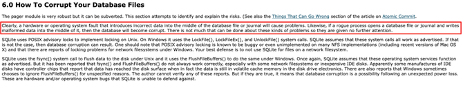 SQLite官网对于数据库损坏问题也有说明:数据库读写过程中出现文件fsync失败、磁盘损坏、异常数据写入等问题,均有可能造成数据库损坏。