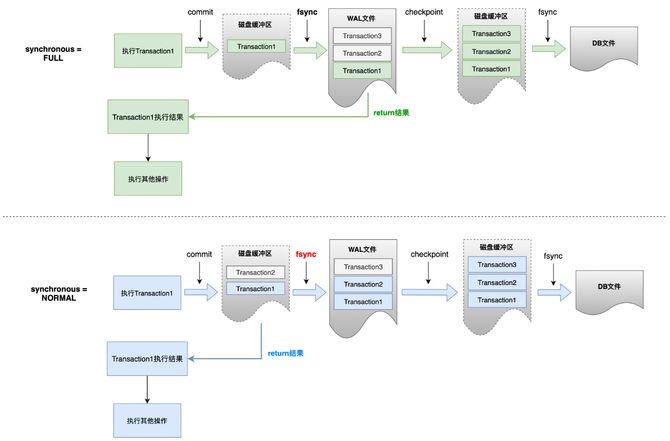常用的WAL同步模式主要有两种:PRAGMA schema.synchronous = NORMAL | FULL,二者区别在于NORMAL在写WAL文件时会在fsync执行前就返回提交结果,而FULL模式会在WAL文件真正写入磁盘后才返回结果。