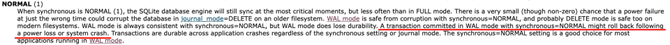 SQLite官方文档中提到:NORMAL模式下,事务的提交在掉电或系统崩溃时可能会被回滚。