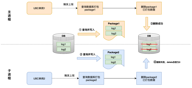 存在两个UBC实例,同时有打点A和B进入并触发打包,两个UBC实例并发,均查询到数据库中的打点C并打包上报。